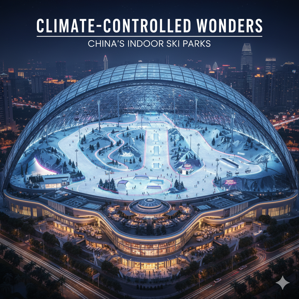 China’s ambition for indoor environments extends even further into specialized climate-controlled resorts. Massive indoor ski parks, like the popular Harbin Wanda Indoor Ski and Winter Sports Resort, and others planned for subtropical regions near Shenzhen and Shanghai, bring year-round winter sports to areas where natural snow is unheard of.